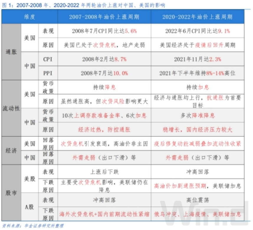 一是美股主要受基本面和流動性影響:首先,2008 年高油價、高通脹時美股下跌主要受次貸危機影響,美聯(lián)儲當(dāng)時仍處于降息周期中;其次,2022 年高油價導(dǎo)致美國通脹預(yù)期進一步上升,從而導(dǎo)致美聯(lián)儲加息,引起美股下跌。二是 A 股主要受外部環(huán)境和流動性影響:首先,2008 年A股下跌主要受海外次貸危機影響,疊加 2007 年開始的流動性緊縮;其次,2022 年A 股下跌主要受俄烏沖突、上海疫情以及美聯(lián)儲加息等影響,國內(nèi)流動性維持邊際寬松。